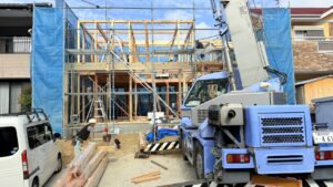 いの町N様邸、お天気にも恵まれ、本日無事に上棟の日を迎えました。