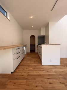 アーチ型入り口のパントリーやコンロ周りのタイルが印象的なキッチン。