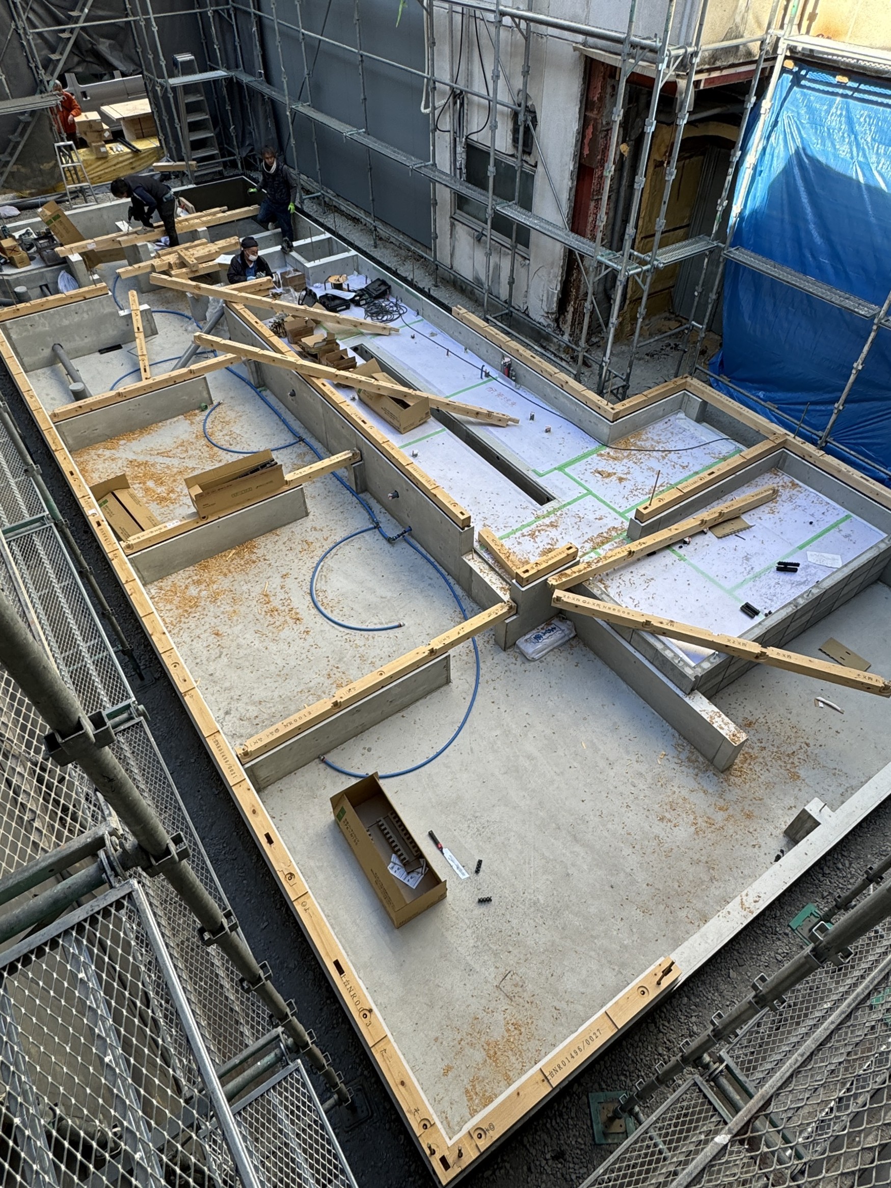 足場を設置し土台敷です。
