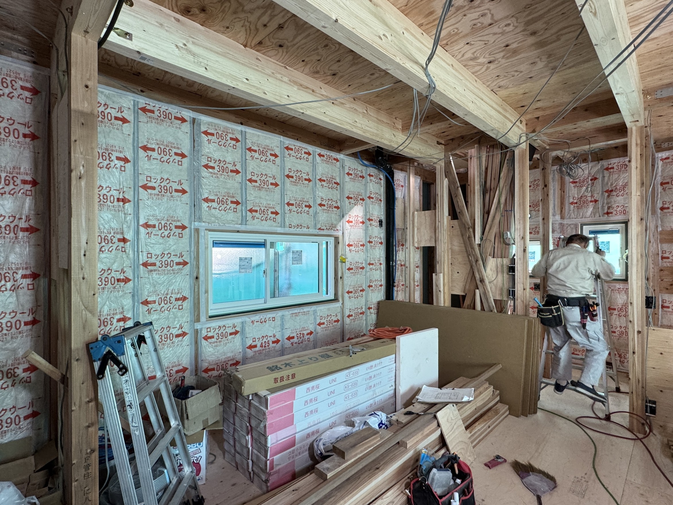 壁の断熱材を隙間なく施工していきます。