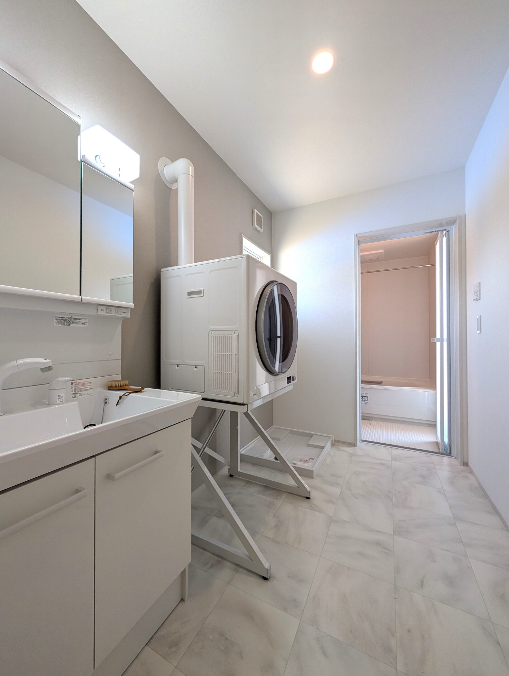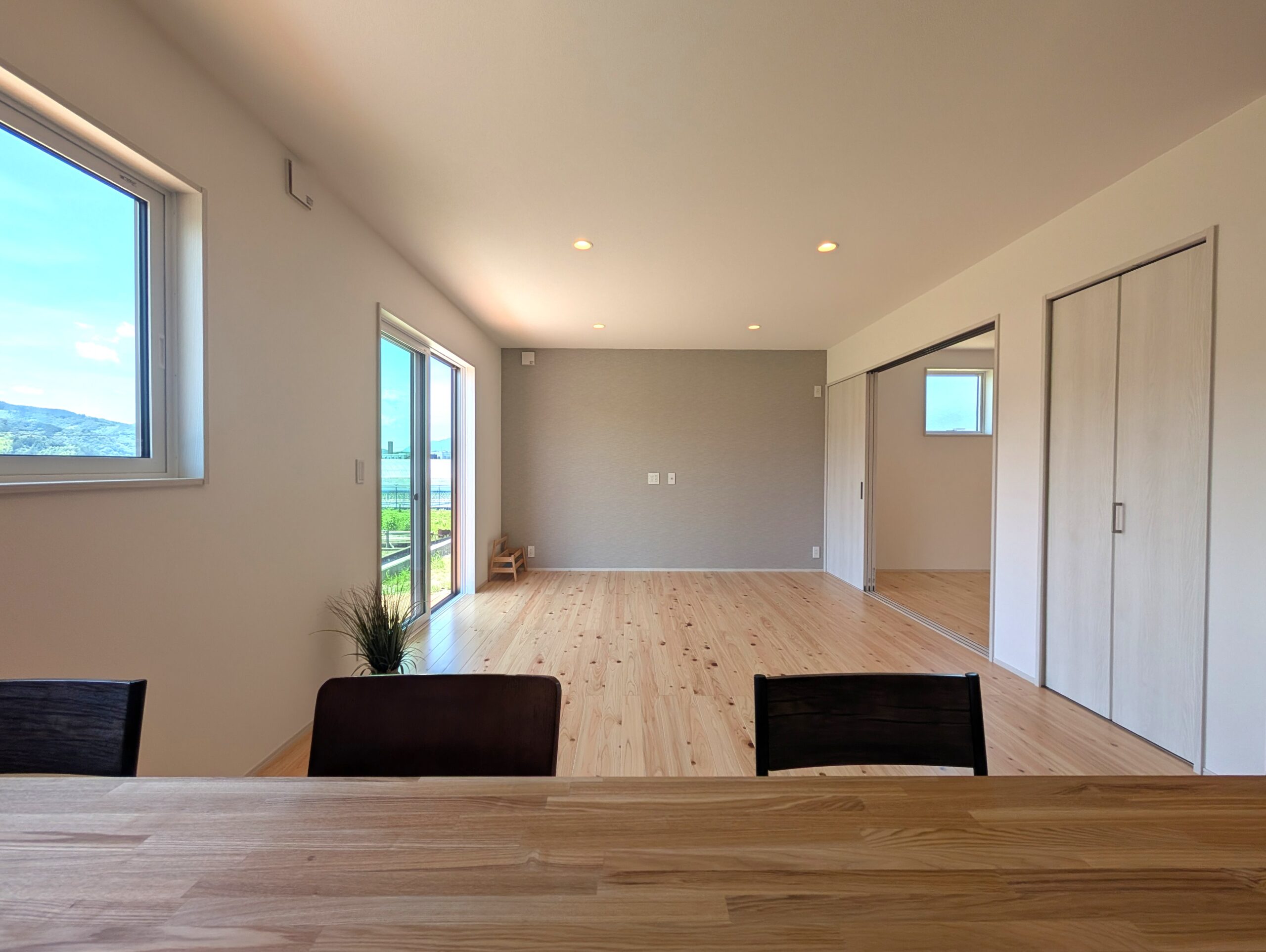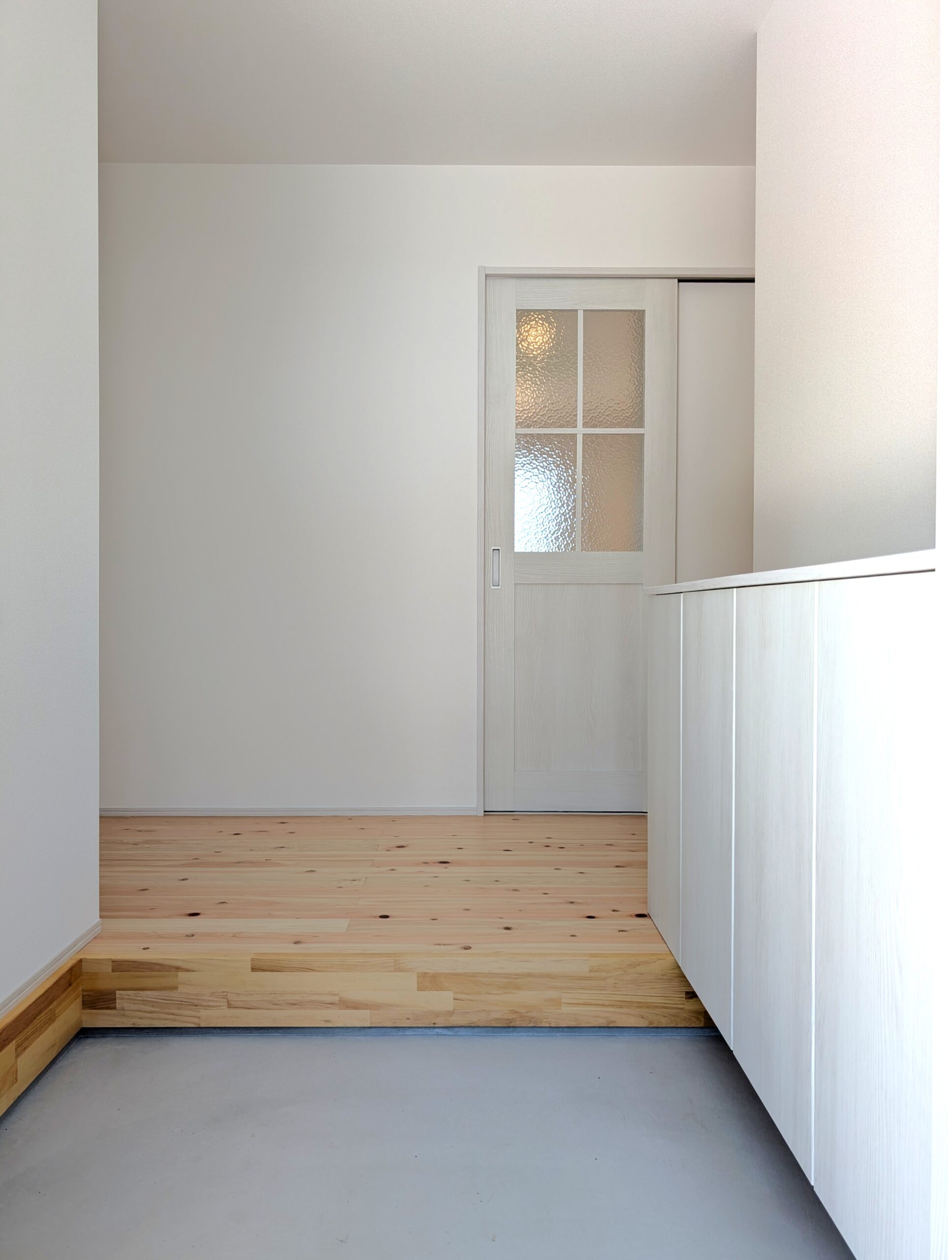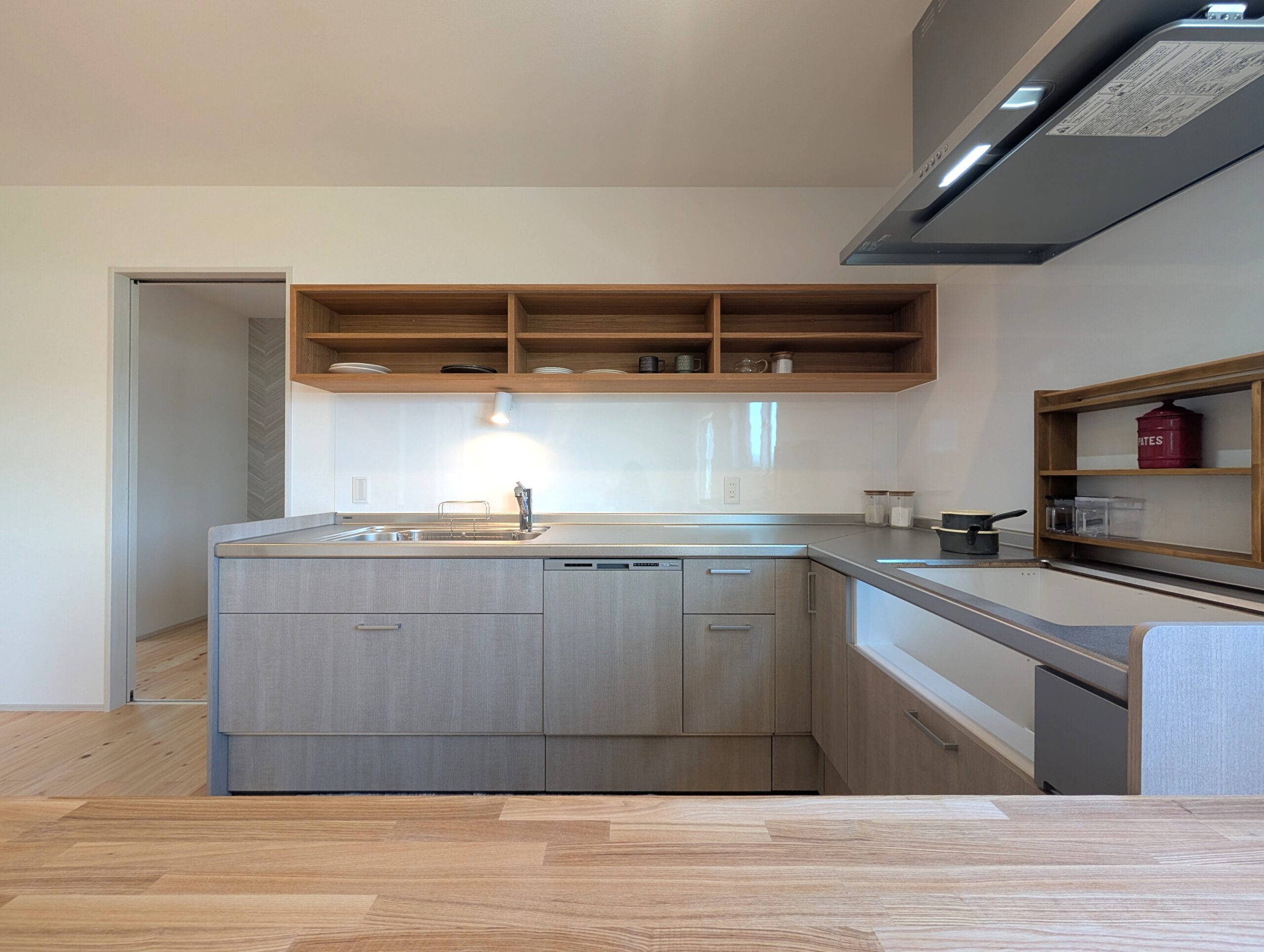 システムキッチンと木製カウンターを組み合わせたコの字型キッチン