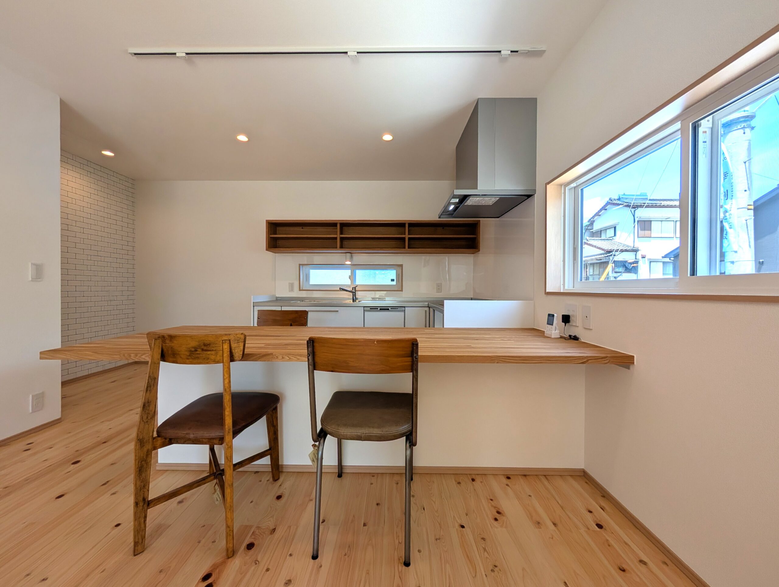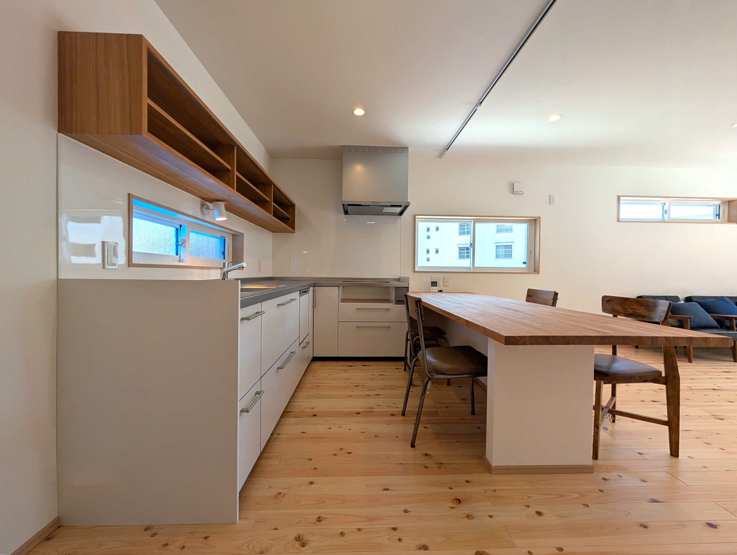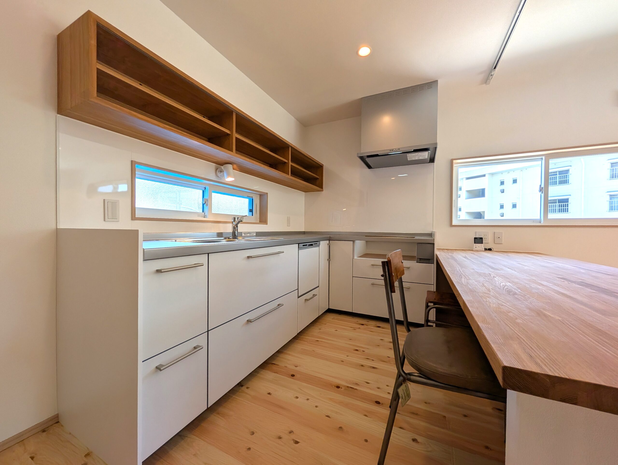 システムキッチンと木製カウンターを組み合わせたコの字型キッチン