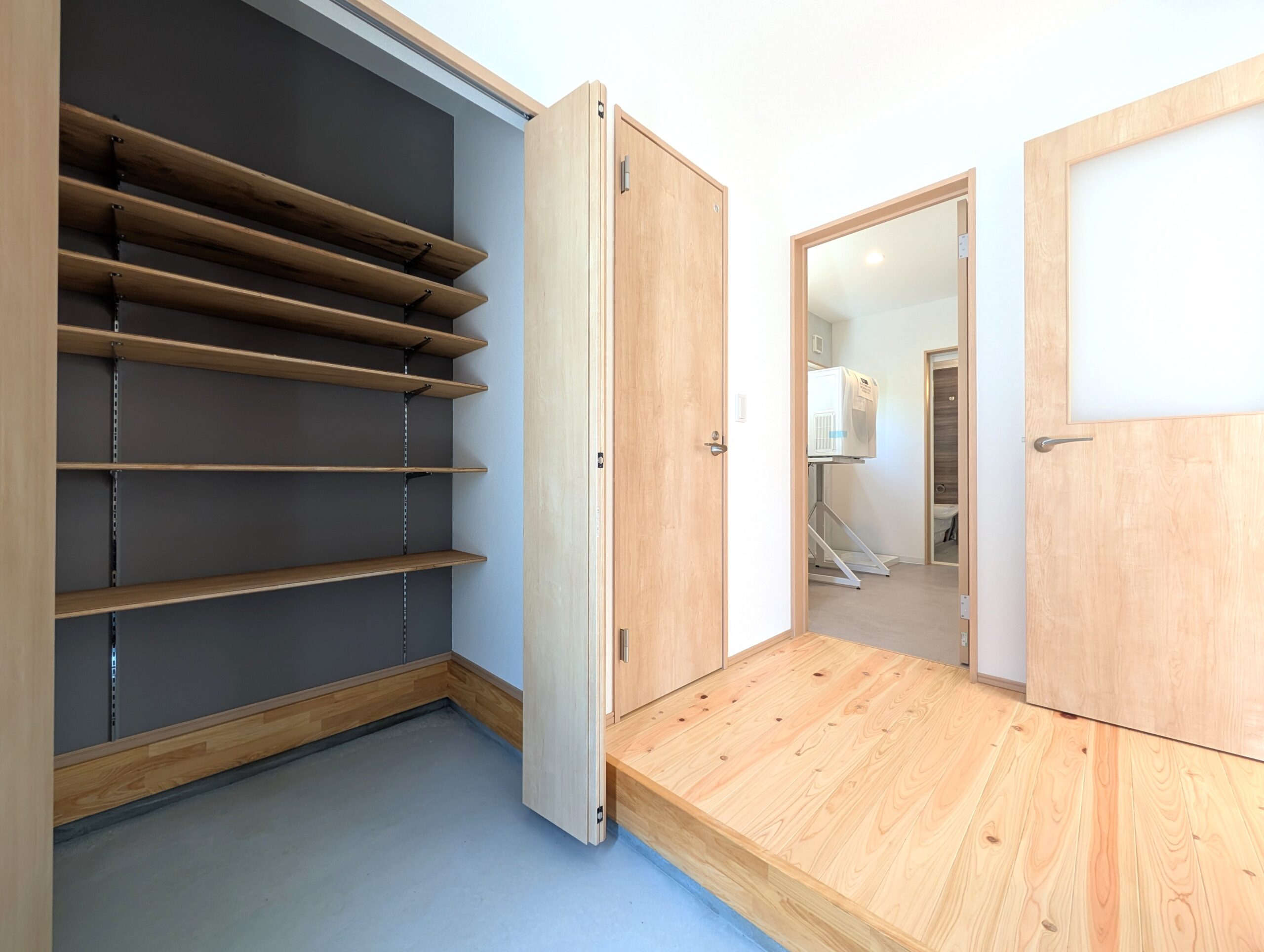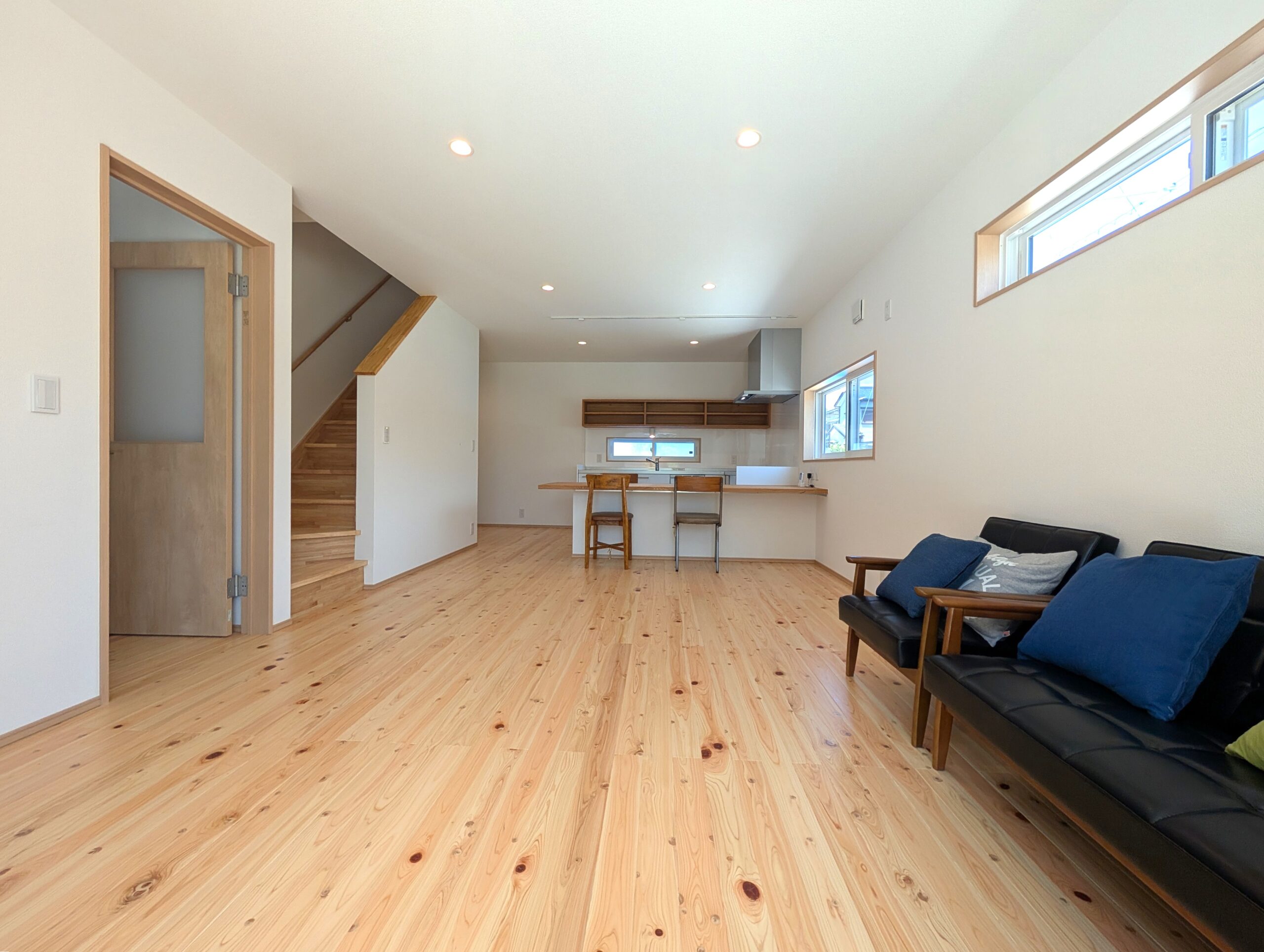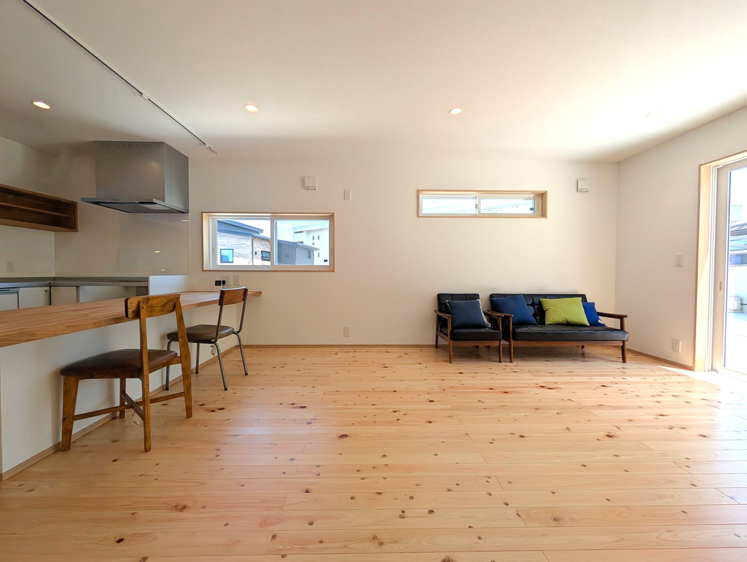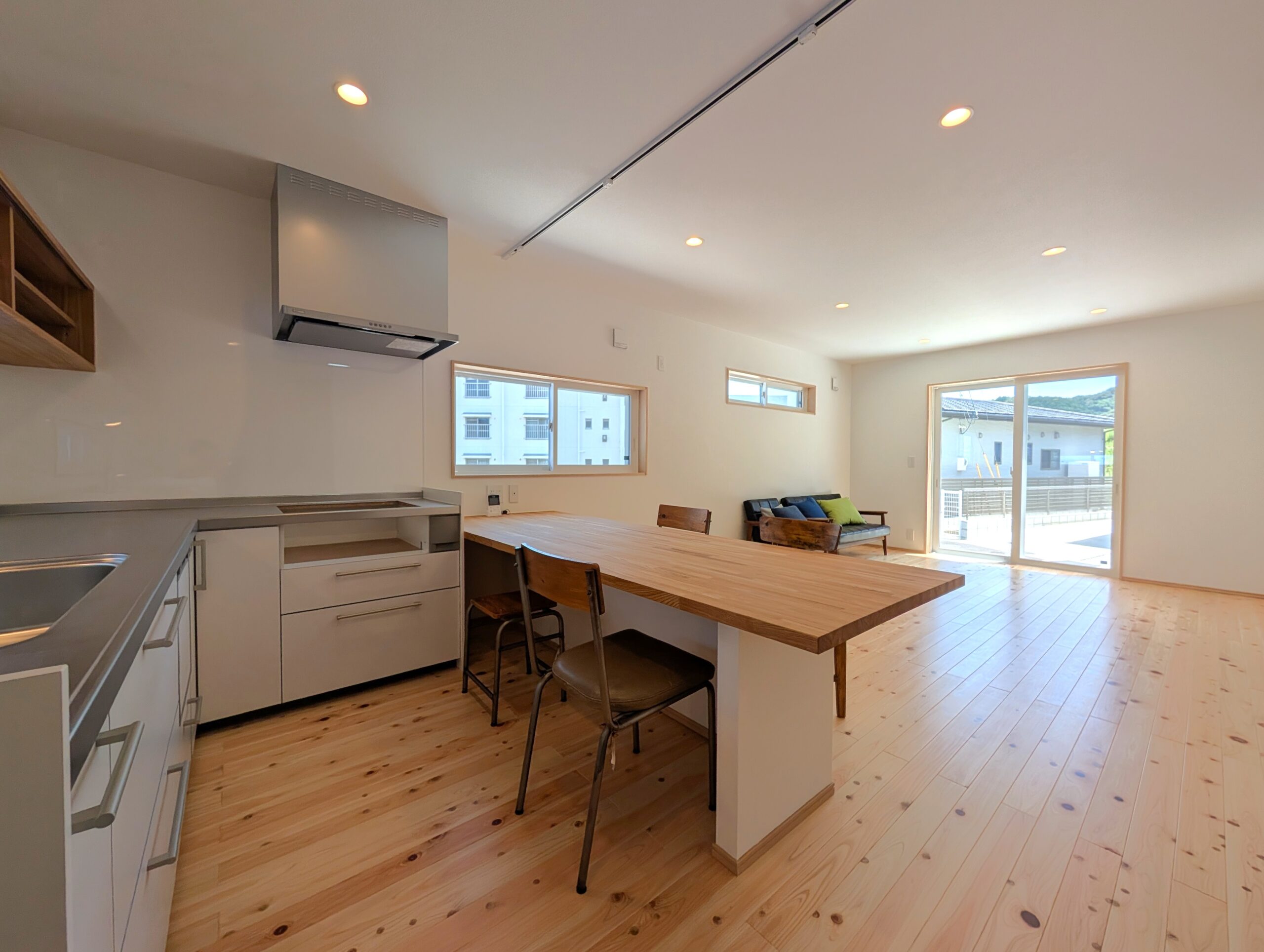 システムキッチンと木製カウンターを組み合わせたコの字型キッチン